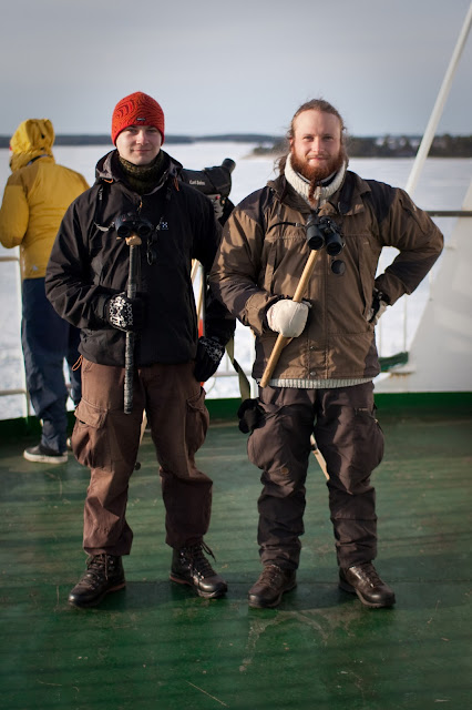 Säätiedotukset ennustivat kylmää kyytiä koko viikonlopulle. Pohjois-länsituulta 9-12 m/s, lumikuuroja, lämpötila keikkuisi plussan molemmin puolin. Ensimmäisiä muuttajia oli jo saapunut Ahvenanmaalle, mutta huikeilla massoilla ja monipuolisella lajistolla tuskin juhlittaisiin. Tätä se oli ollut jo pari päivää ennen lähtöä ja tätä se sitten lopulta olikin. Pukeutumiskysymys, sanoi jalustaansa laivan kannella pystyttävä staijari. Kyllä siellä jotenkin tarkeni, vasta kuuden tunnin seisoskelun jälkeen Maarianhaminan satamassa hieman palelsi. Vaikka välillä tuuli tahtoi kaataa orneja kumoon ja säännölliset lumikuurot nakersivat staijausmotivaatiota. Kuten tuolla aikaisemmin höpisin, monista tutuista lajeista (sepel- ja uuttukyyhky, meri- ja kanadanhanhi, merimetso, merilokki) ropisi vuodareita, myös heti Turun satamassa havaittu isolepinkäinen lämmitti. Itselleni päivän kovin havis pamahti n. pari tuntia lähdön jälkeen, kun Aksu huikkasi muulle porukalle löytäneestään maakotkasta! Kotka kuitenkin tippui metsäiselle luodolle saman tien, mutta pienen odottelun jälkeen lintu nousi näkyville, kisaili merikotkan kanssa ja jäi kivasti kaartelemaan näytille, jolloin kaikki kannella päivystäneet ehtivät tämän unelmalajin näkemään.